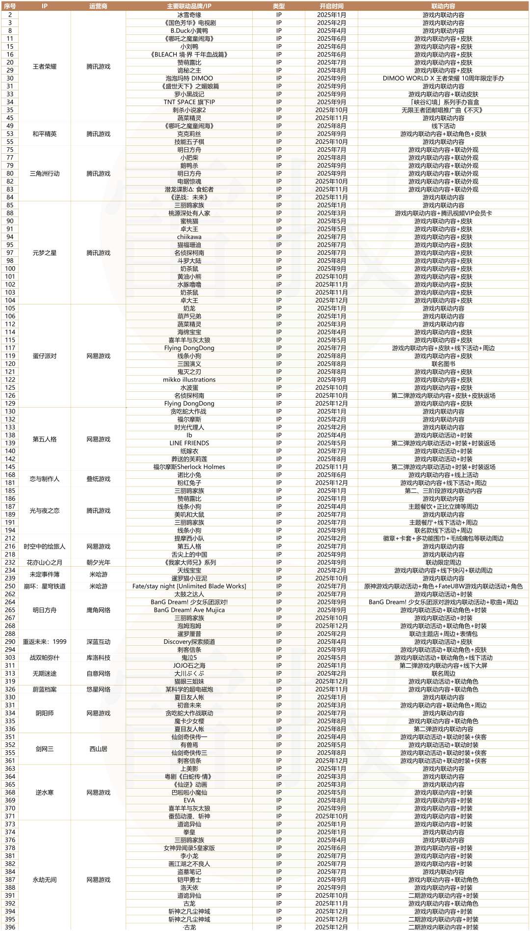 据此,雷报扒遍了过去一年的联名记录,发现2025年仅29款主流游戏IP就疯狂落地了近400场联名合作(人工统计存在误差)。相当于平均每天都有1起以上的新联动上线,狂热程度简直让人瞠目结舌。