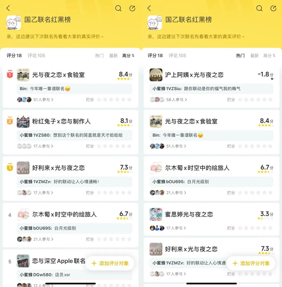 2025年暑期,一份由玩家自发评选的“国乙联名红黑榜”就极具代表性。榜单上,《光与夜之恋》与食验室、好利来的合作跻身红榜第一、第三;而《光与夜之恋》与沪上阿姨的联名却高居黑榜榜首。